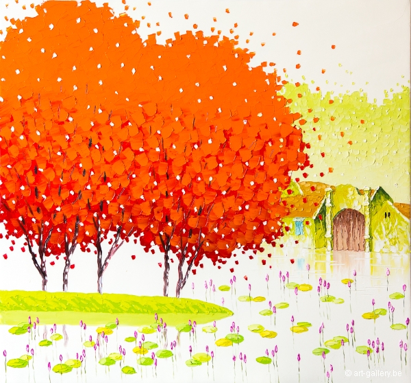Peinture originale par Phan Thu Trang . L'utilisation de couleurs vives et pastel et des arbres sphériques contrôlées dégage une certaine " joie " de ses peintures . Images élégantes de Trang de paysages combinées avec les techniques exclusives de peinture ont déjà suscité l'intérêt des collectionneurs d'art internationaux .