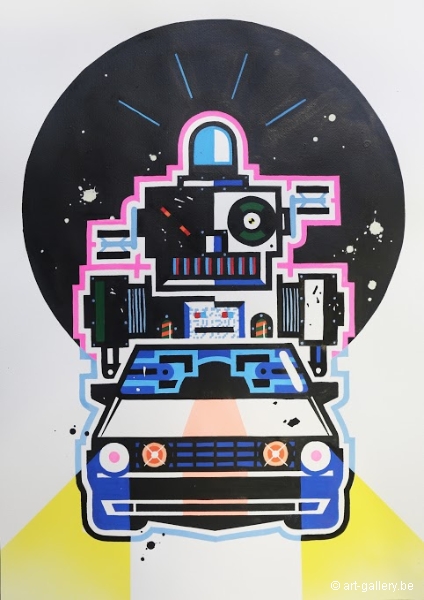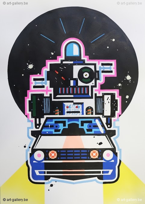 Peinture originale sur papier de Blancbec. Signé et daté. Le travail a été fait avec de la peinture acrylique et graffiti. Le travail est encadré dans un cadre blanc avec du verre UV- protection.