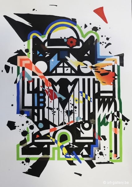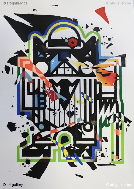Signé et daté. Le travail a été fait avec de la peinture acrylique et graffiti. Le travail est encadré dans un cadre blanc avec du verre UV- protection.