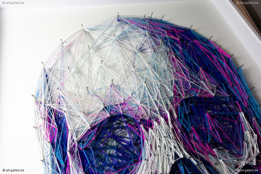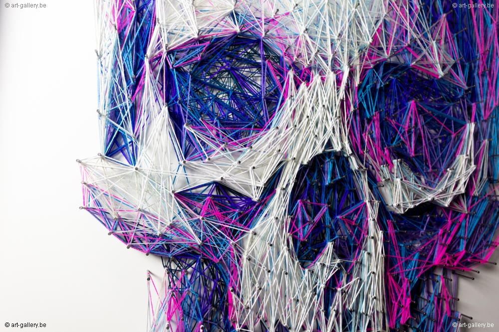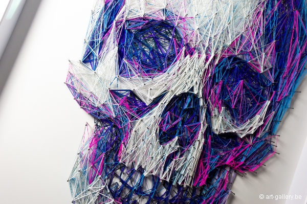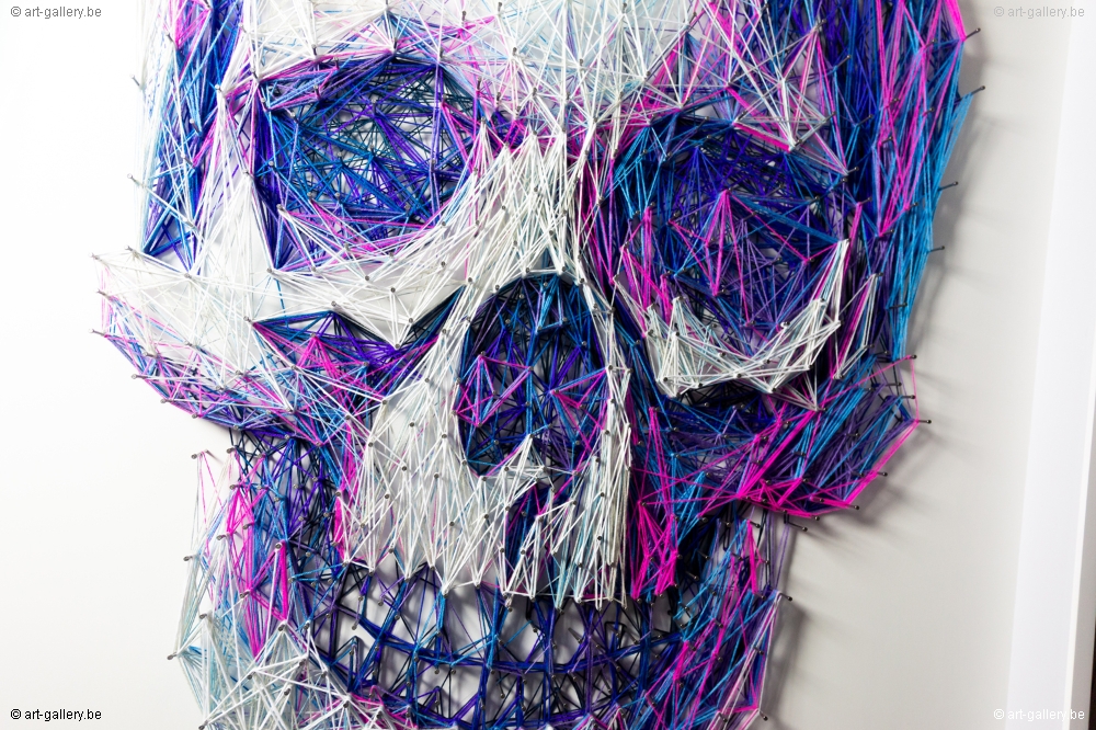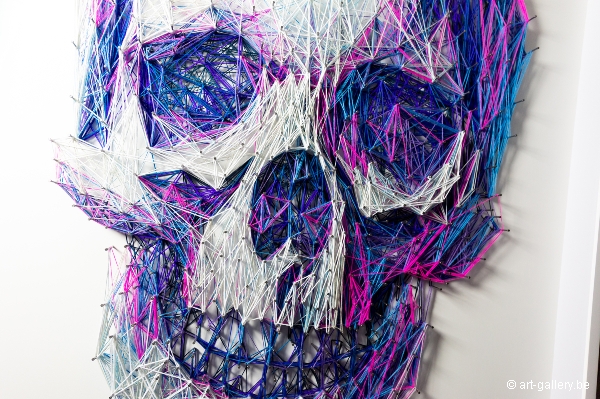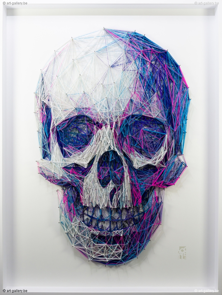 Oeuvre originale de crâne de cordes par Steve Locatelli. L'?uvre est montée derrière une vitre de musée antireflet et porte une signature. Le crâne était composé de clous construits en forme de crâne. Ensuite, les ongles ont été connectés avec des fils pour créer un bel effet 3D. Selon Steve, un crâne est si universel que vous ne pouvez pas voir si c'était un garçon ou une fille ou si c'était une personne blanche, africaine ou chinoise. Nous sommes tous pareil!