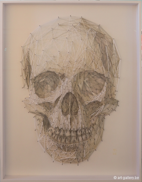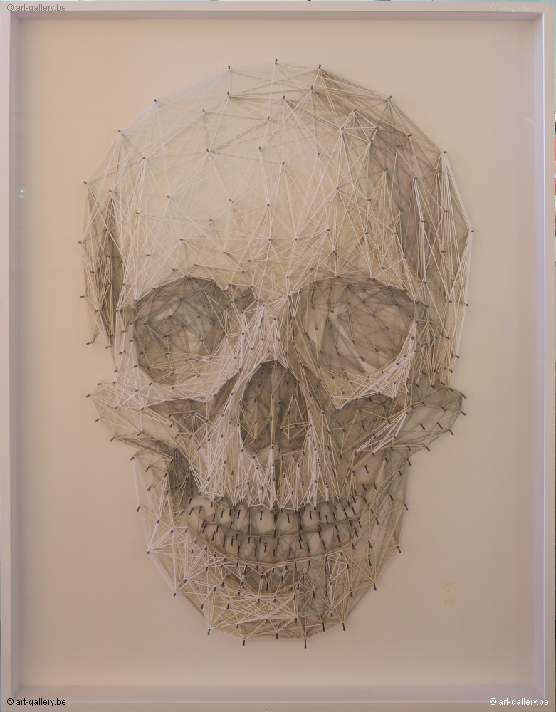 Oeuvre originale de crâne de cordes par Steve Locatelli. L'?uvre est montée derrière une vitre de musée antireflet et porte une signature. Le crâne était composé de clous construits en forme de crâne. Ensuite, les ongles ont été connectés avec des fils pour créer un bel effet 3D. Selon Steve, un crâne est si universel que vous ne pouvez pas voir si c'était un garçon ou une fille ou si c'était une personne blanche, africaine ou chinoise. Nous sommes tous pareil!