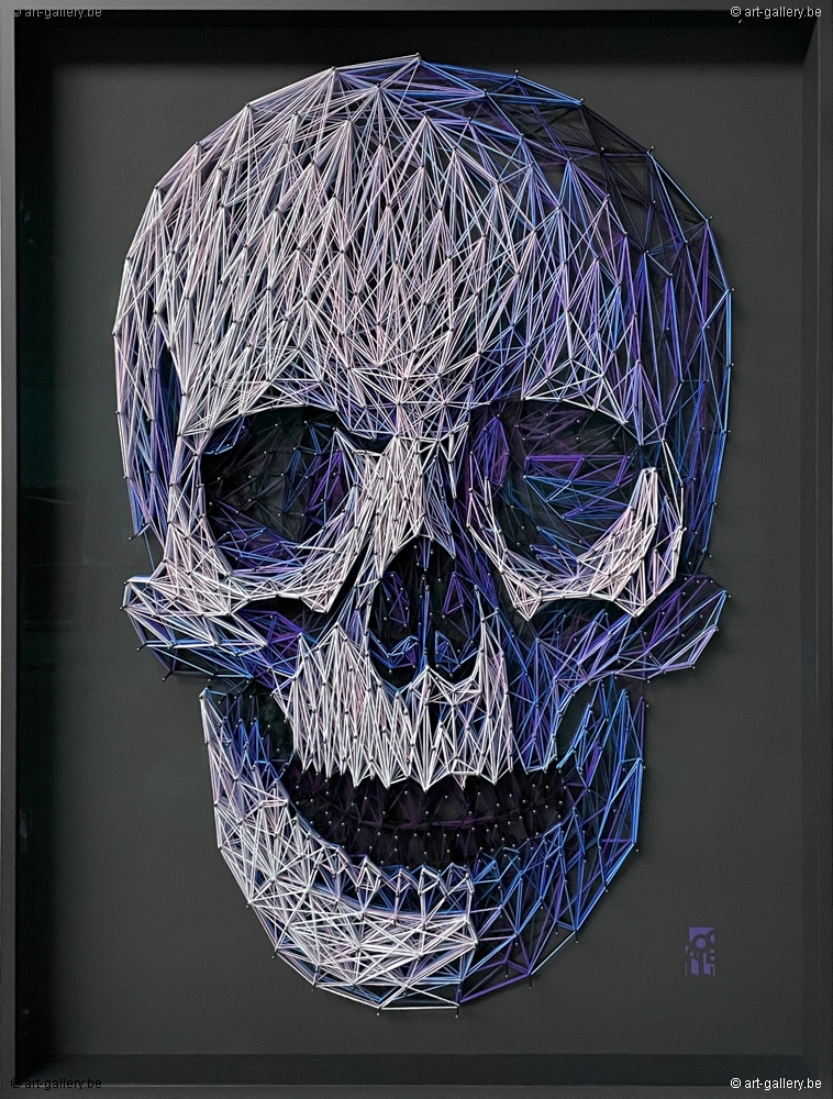 Oeuvre originale de crâne de chaîne par Steve Locatelli. L'oeuvre est montée derrière une vitre de musée antireflet et porte une signature. Le crâne était composé de clous construits en forme de crâne. Ensuite, les clous ont été connectés avec des fils pour créer un bel effet 3D. Selon Steve, un crâne est tellement universel qu'on ne peut pas dire s'il s'agit d'un garçon ou d'une fille ou s'il s'agit d'une personne blanche, africaine ou chinoise. Nous sommes tous pareil!
