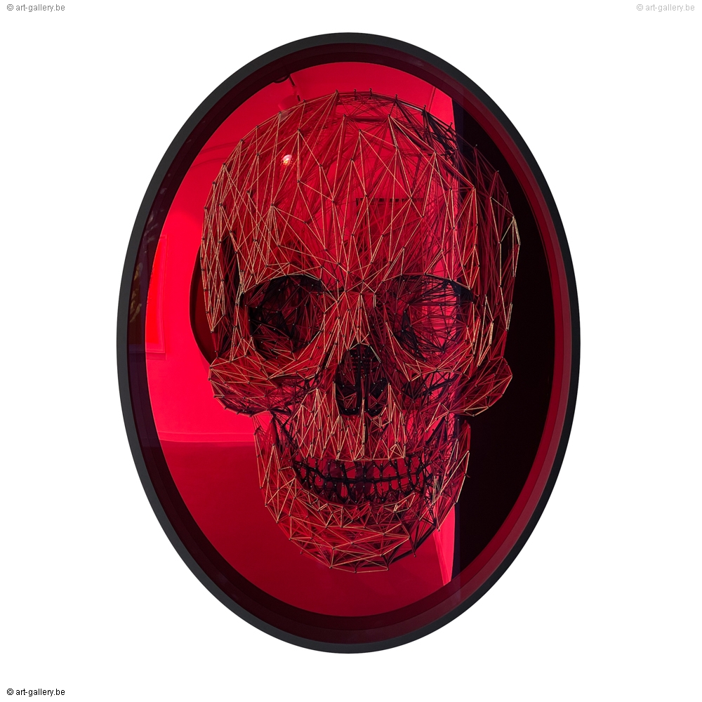 Oeuvre originale de crâne de chaîne par Steve Locatelli. L'oeuvre est montée derrière une vitre de musée antireflet et porte une signature. Le crâne était composé de clous construits en forme de crâne. Ensuite, les clous ont été connectés avec des fils pour créer un bel effet 3D. Selon Steve, un crâne est tellement universel qu'on ne peut pas dire s'il s'agit d'un garçon ou d'une fille ou s'il s'agit d'une personne blanche, africaine ou chinoise. Nous sommes tous pareil!