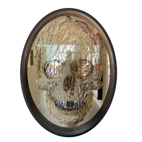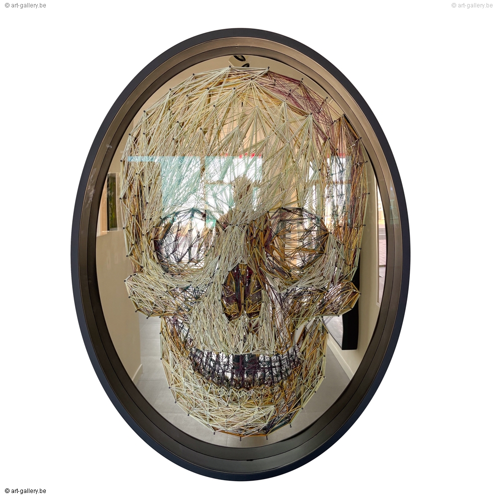 Oeuvre originale de crâne de chaîne par Steve Locatelli. L'oeuvre est montée derrière une vitre de musée antireflet et porte une signature. Le crâne était composé de clous construits en forme de crâne. Ensuite, les clous ont été connectés avec des fils pour créer un bel effet 3D. Selon Steve, un crâne est tellement universel qu'on ne peut pas dire s'il s'agit d'un garçon ou d'une fille ou s'il s'agit d'une personne blanche, africaine ou chinoise. Nous sommes tous pareil!