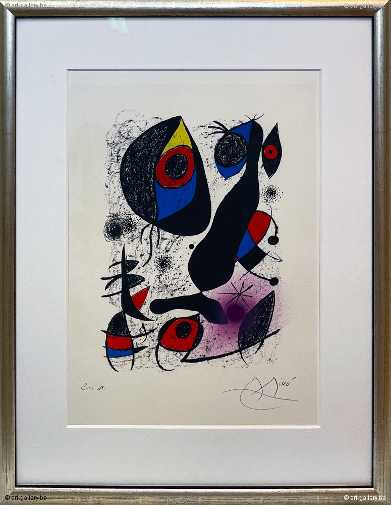 Lithographie de Miro. Signé et numéroté sur 70 exemplaires + 3 épreuves (ea). L'oeuvre est encadrée professionnellement dans du verre antireflet.
