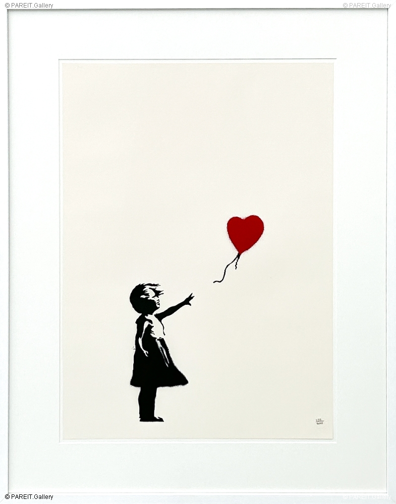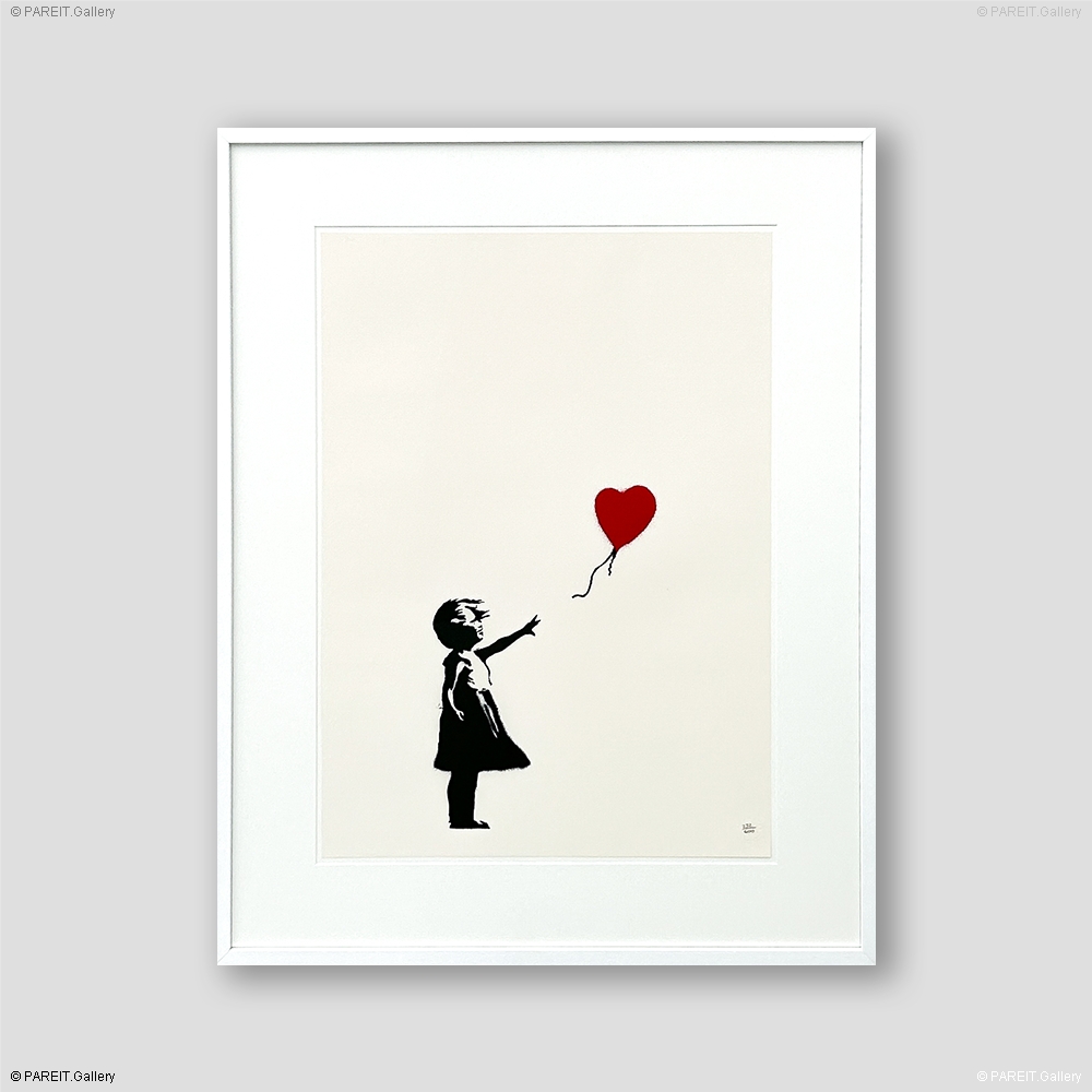 Girl with Balloon est l'une des oeuvres les plus emblématiques et reconnues de Banksy. L'image représente une jeune fille de profil, le bras tendu vers un ballon rouge en forme de coeur qui flotte juste hors de sa portée. Ses cheveux et sa robe sont emportés par une forte rafale de vent, suggérant le mouvement, la fugacité et un instant figé dans le temps. La scène est délibérément ambiguë - il est difficile de savoir si la fillette a volontairement lâché le ballon dans un élan de liberté enfantine ou si elle l'a perdu accidentellement et le regarde s'éloigner avec désespoir.