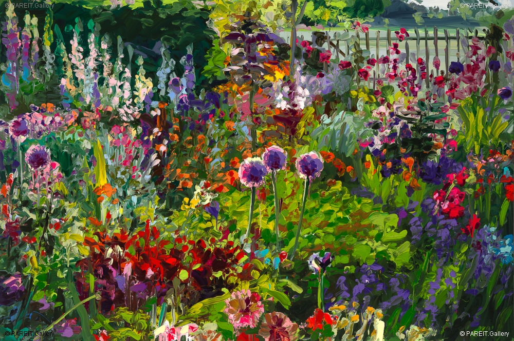 Fleurs, feuilles et lumière -photographiés en préparation de ces séries lors de visites aux Kew Gardens de Londres et dans les jardins de Claude Monet à Giverny -se transforment sur la toile en compositions dynamiques, profondes et énergétiques. La lumière vacillante et les teintes vibrantes suggèrent le mouvement constant du soleil sur un feuillage ou un pétale, conférant aux peintures un effet spatial marqué.