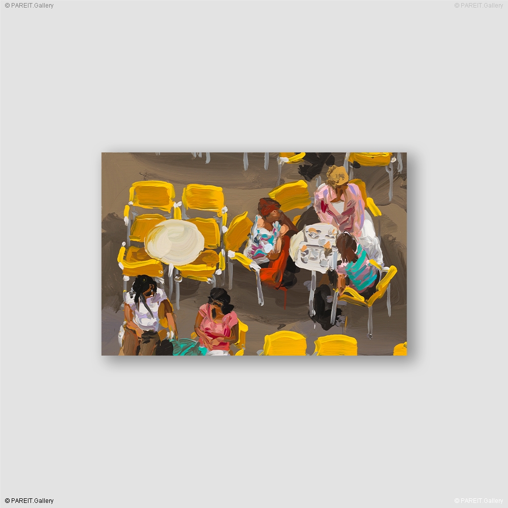 " Yellow Chairs " naît de la fascination de Jan De Vliegher pour le rythme, la symétrie et le caractère pictural des scènes méridionales -des impressions marquantes glanées au fil de ses voyages en Italie. Là où la série " San Marco " saisit Venise à travers la lumière et la couleur, " Yellow Chairs " se concentre sur les terrasses baignées de soleil, où le vide et la présence se relaient subtilement. Les chaises jaunes vives -parfois vides, parfois habitées d'une présence humaine légère -composent un jeu rythmique de formes et de couleurs. Témoins silencieux de la vie méditerranéenne, elles deviennent un symbole universel de détente, de conversation et de convivialité sous la lumière chaude de l'Italie. Avec sa touche libre et humide-sur-humide, De Vliegher traduit ces scènes en impressions sensorielles, où la lumière, les contrastes de couleur et l'espace se fondent harmonieusement. Moins que des représentations littérales d'objets ou de lieux, ce sont des évocations d'une atmosphère, d'un temps, d'un espace -l'expression d'un sentiment unique que seules les terrasses italiennes peuvent susciter. " Yellow Chairs " s'inscrit ainsi dans le prolongement de l'exploration de la lumière et de la mémoire entamée avec la série " San Marco ", et approfondit sa recherche picturale sur la manière dont l'espace et la couleur peuvent ensemble engendrer une expérience émotionnelle.