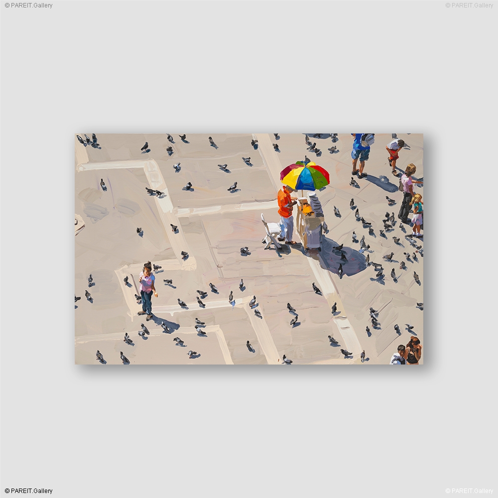 Avec sa touche expressive, Jan De Vliegher insuffle une nouvelle vie à la place Saint-Marc à Venise. Dans la série " San Marco ", il transforme ce paysage urbain iconique en un jeu de lumière, de peinture et d'atmosphère. Ce qui commence par une photographie se développe au fil du processus pictural en une expérience sensorielle et en couches multiples. Cette série, lancée en 2005 et reprise en 2020 et 2021, témoigne de la fascination durable de De Vliegher pour l'Italie et sa richesse visuelle. Dans les oeuvres plus récentes de " San Marco ", la place baigne dans une lumière pleine et chaude : des teintes chaleureuses, des touches libres et une composition qui repose davantage sur l'émotion que sur la perspective. Les visiteurs et les oiseaux -les incontournables pigeons de la place -font partie intégrante du tableau. Leur présence se fond dans le rythme des couleurs et des touches, ce qui confère à l'ensemble une vitalité spontanée. La place grise se colore et devient une expérience où la figuration se dissout dans le mouvement. Venise n'apparaît pas comme un cliché touristique, mais comme un souvenir impressionniste en peinture.
