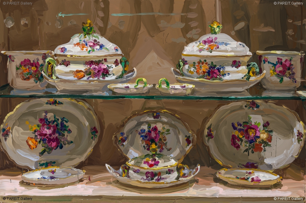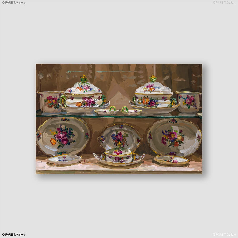 Des objets anciens raffinés portent un luxe discret -souvenirs d'une époque où beauté, statut et raffinement allaient de pair sans effort. Cette splendeur révolue intrigue Jan De Vliegher depuis des années et constitue le point de départ de sa série " Treasury ". Sur chaque tableau, on découvre une vitrine remplie de porcelaine : plats, assiettes, tasses, .... Ce qui, autrefois, se tenait immobile et fragile derrière une vitre devient, sous le pinceau de De Vliegher, une expérience sensorielle -puissante, colorée, intense. L'image semble aspirer le spectateur à l'intérieur de la vitrine, révélant une profondeur de brillance, de mouvement et de peinture pure. De Vliegher ne choisit pas une représentation littérale, mais une évocation. Les ornements et le service se réduisent à leur essence -mémoire, désir. La série a été présentée pour la première fois en 2011 au Château de Gaasbeek et trouve son origine dans une visite au Victoria & Albert Museum de Londres. Aujourd'hui, tant d'années plus tard, " Treasury " continue de se développer -comme un dialogue vivant entre passé et présent, entre regard et immersion.