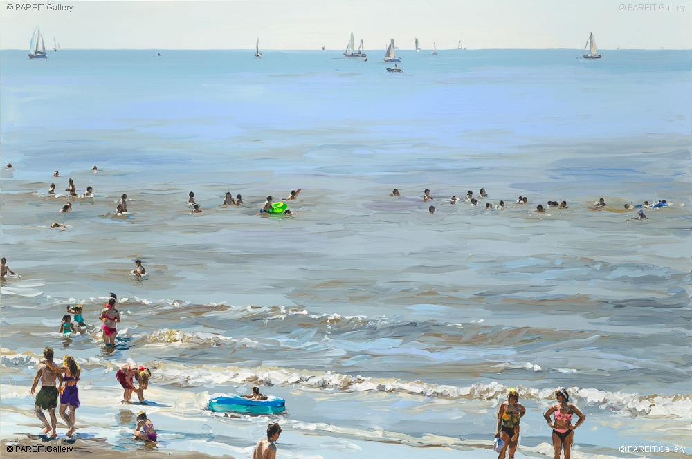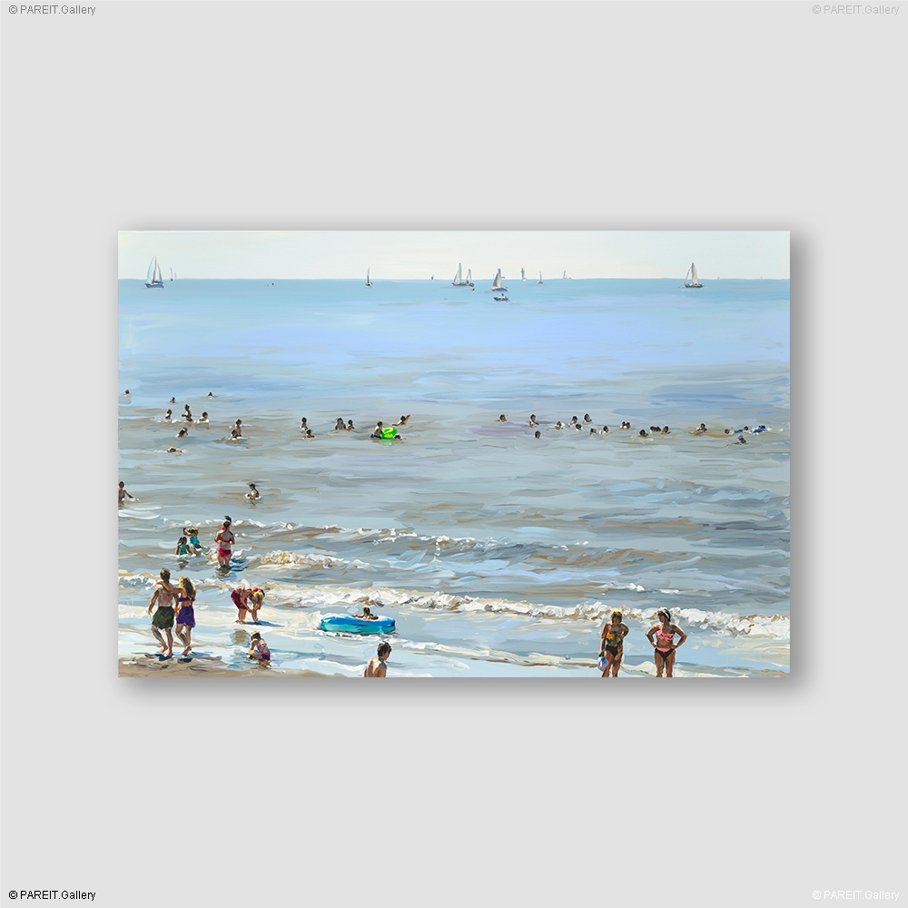 Dans la série " Beach ", Jan De Vliegher part de ses propres photos de la mer, prises depuis la plage, la jetée ou un appartement à Knokke. Les oeuvres respirent une palette bleu clair, dans laquelle des figures humaines apparaissent çà et là ou semblent flâner à travers la surface picturale. C'est l'une des rares séries où la figure humaine occupe un rôle actif -aux côtés de " San Marco ", " Yellow Chairs " et la plus récente " Versailles ". La mer n'y est pas un simple décor statique, mais une surface vivante, vibrante. Par des coups de pinceau énergiques, De Vliegher saisit le mouvement de l'eau et les reflets capricieux de la lumière. Sa fascination pour la manière dont la lumière influence notre perception de la couleur trouve ici toute son expression. Un élément marquant et récent de cette série réside dans les accents subtils de peinture fluo, mis au point par l'artiste lui-même : de petites interventions, mais d'une grande intensité, qui illuminent les images et leur confèrent une vitalité irrésistible. " Les couleurs néon ont la capacité de briller plus intensément que le blanc ", affirme l'artiste. Cet effet se manifeste tout particulièrement dans les vêtements estivaux des baigneurs, où il crée une tension visuelle saisissante : l'oeil est littéralement accroché par cette lueur. Les contrastes se renforcent, et les zones les plus claires semblent presque rayonner. La série " Beach " unit ainsi virtuosité technique et énergie estivale, familière, qui continue de fasciner.