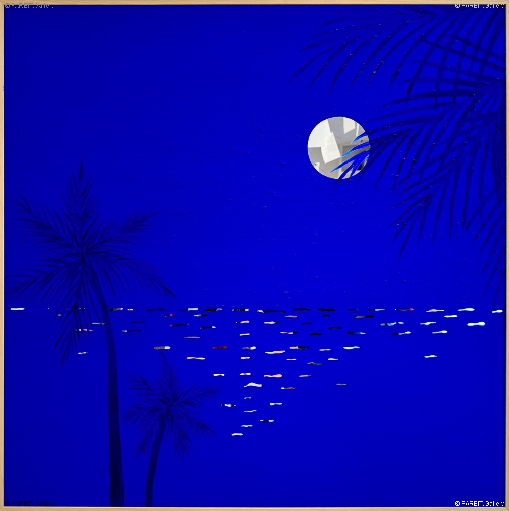 Info complémentaires: Cette oeuvre fait partie de la série Summer Nights (2025), dans laquelle l'artiste explore des compositions bichromes sur une surface réfléchissante. La série repose sur deux couleurs, dominées par un bleu profond et intensément pigmenté, inspiré du célèbre bleu d'Yves Klein.