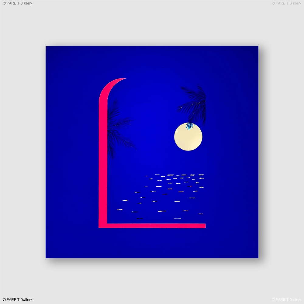 Cette oeuvre fait partie de la série Summer Nights (2025), dans laquelle l'artiste explore des compositions bichromes sur une surface réfléchissante. La série repose sur deux couleurs, dominées par un bleu profond et intensément pigmenté, inspiré du célèbre bleu d'Yves Klein. Le titre de la série Summer Nights évoque à la fois les nuits chaudes et mystérieuses dans des contrées lointaines, et le sentiment de désorientation à l'arrivée dans un lieu inconnu. Cette ambiance est renforcée par des influence du cinema vintage - on pense aux univers évocateurs de David Lynch, Quentin Tarantino ou Tim Burton. L'oeuvre contient un léger encadrement en aluminium et est réalisée à la peinture acrylique sur miroir plexi, offrant une réflexion e l'image à la fois littérale et métaphorique.