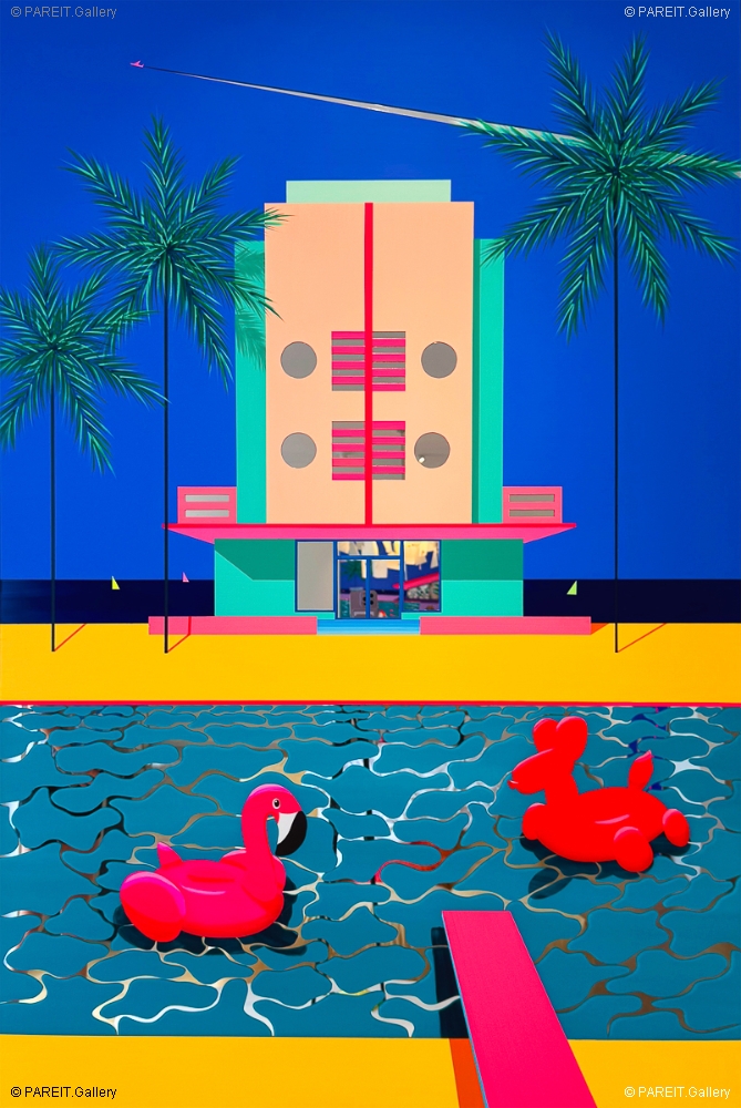 Info complémentaires: Cette oeuvre fait partie de la série Sunshine Pop (2025) et est une peinture acrylique originale réalisée sur miroir plexi, encadrée d'un fin cadre métallique. Sans savoir où nous sommes ni ce qui nous attend, nous sommes transportés vers des lieux mystérieux et colorés. Pour l'artiste, ces scènes évoquent des souvenirs vivants de divers voyages et racontent son histoire personnelle de Miami. Pour le spectateur, ce sont des oeuvres vibrantes et empreintes de positivités, où les surfaces réfléchissantes et les jeux de lumière participent pleinement au dialogue visuel.