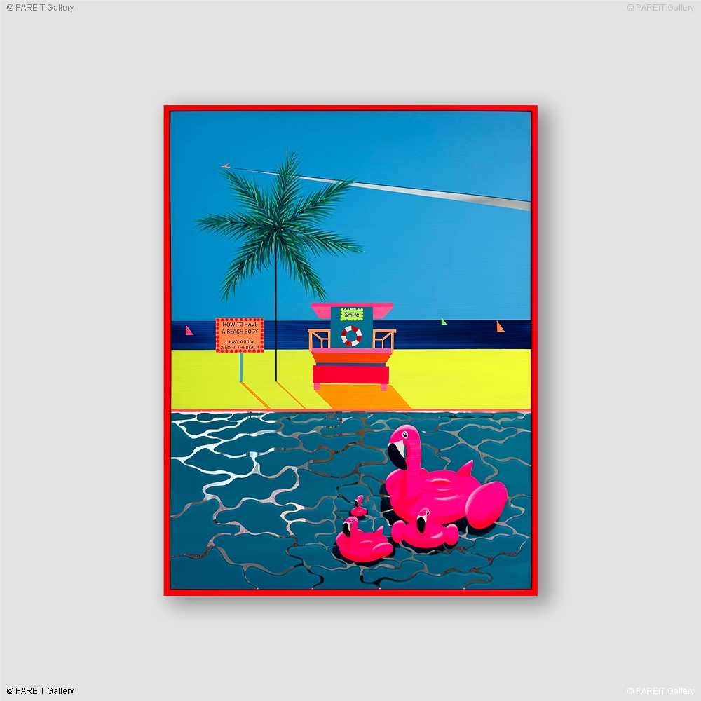 Cette oeuvre fait partie de la série Poolside Postcards 2025, une collection vibrante de clichés de vacances oniriques transformés en peintures. Des instantanés de paradis exotiques où humour, amitié et positivité se rencontrent. Ces peintures acryliques sur miroir dégagent une énergie joyeuse, mêlant symboles ludiques et une touche de surréalisme belge. Comme des cartes postales colorées d'un voyage sans fin, présentées dans un joli cadre coloré.
