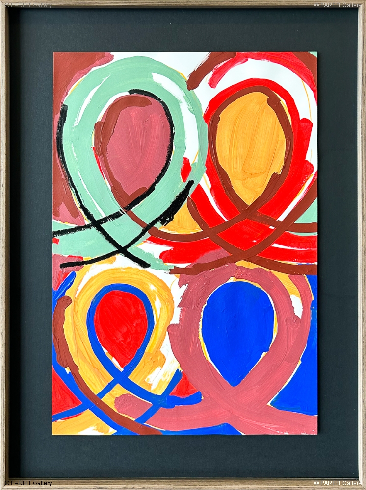 Peinture originale et unique sur papier. L'oeuvre est encadrée dans un élégant cadre en bois, équipée d'un verre anti-UV et prête à être accrochée. Elle se distingue par les "Swoons" reconnaissables : des cercles elliptiques qui réapparaissent sans cesse dans le travail de Piroeh One.