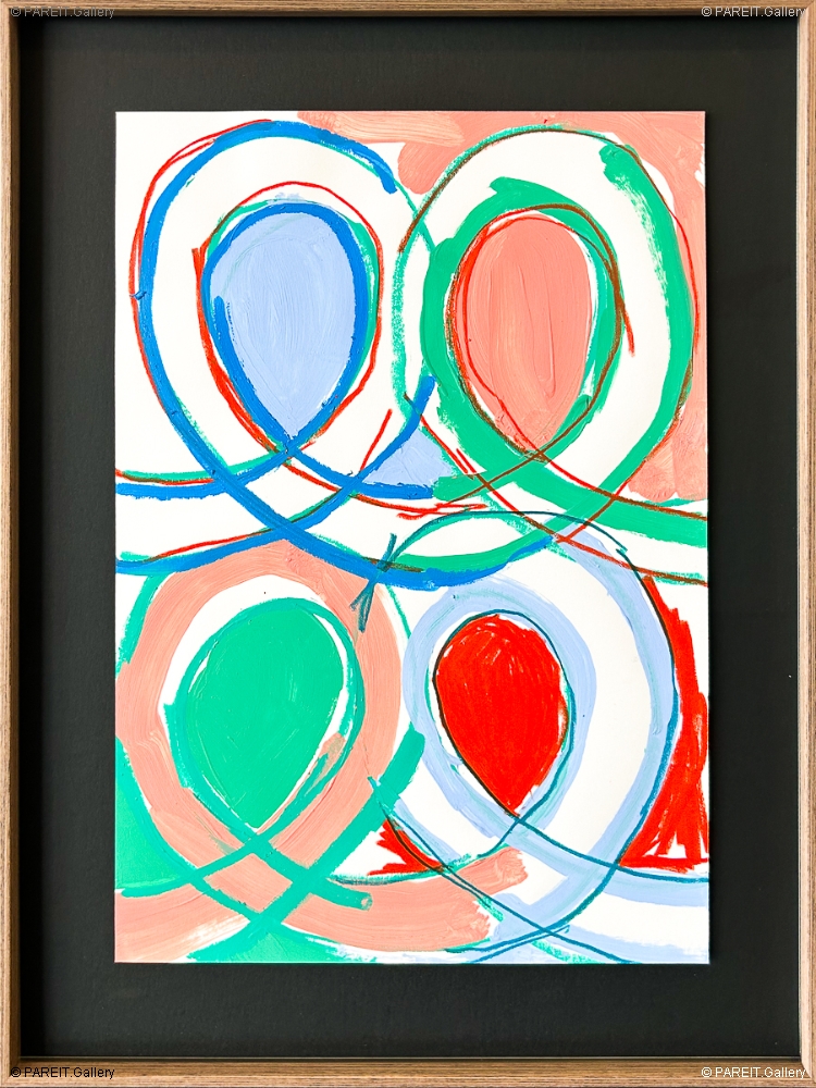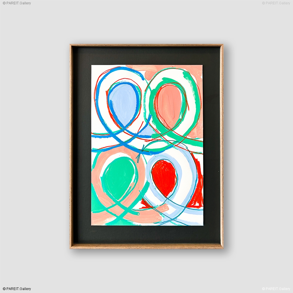 Peinture originale et unique sur papier. L'oeuvre est encadrée dans un élégant cadre en bois, équipée d'un verre anti-UV et prête à être accrochée. Elle se distingue par les "Swoons" reconnaissables : des cercles elliptiques qui réapparaissent sans cesse dans le travail de Piroeh One.