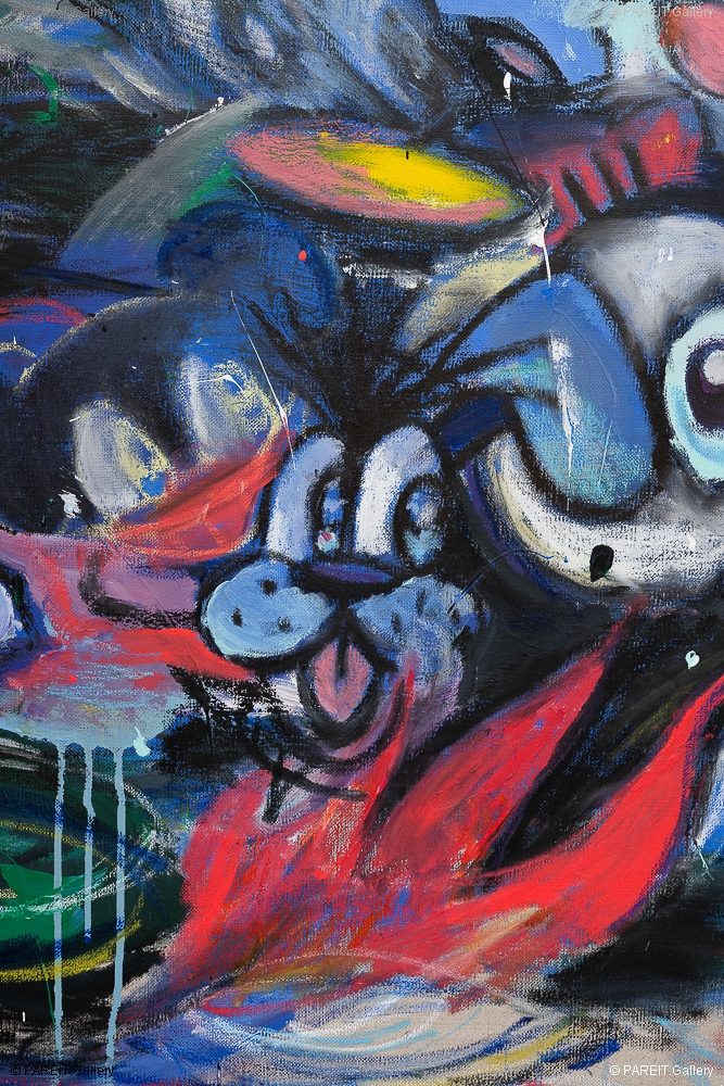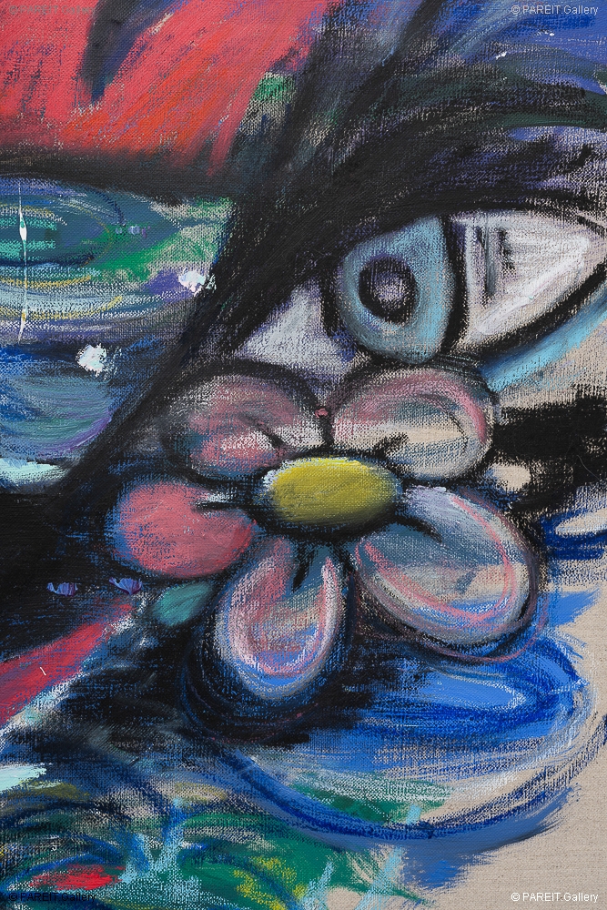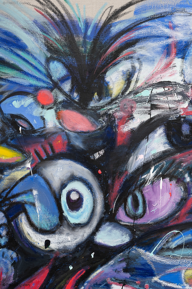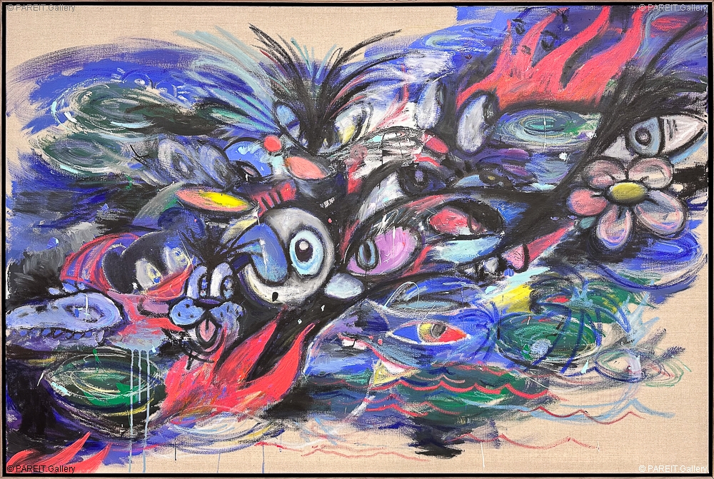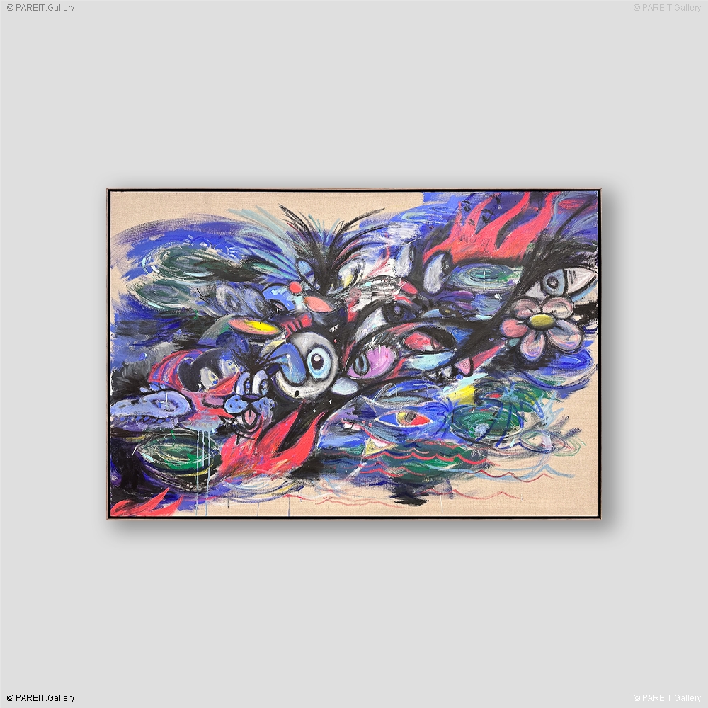 Peinture originale : acrylique et pastel à l'huile sur lin. Une oeuvre mystérieuse, peuplée de personnages subtilement cachés, qui dégage fluidité et mouvement. Cette magnifique création est présentée dans un cadre en bois raffiné.