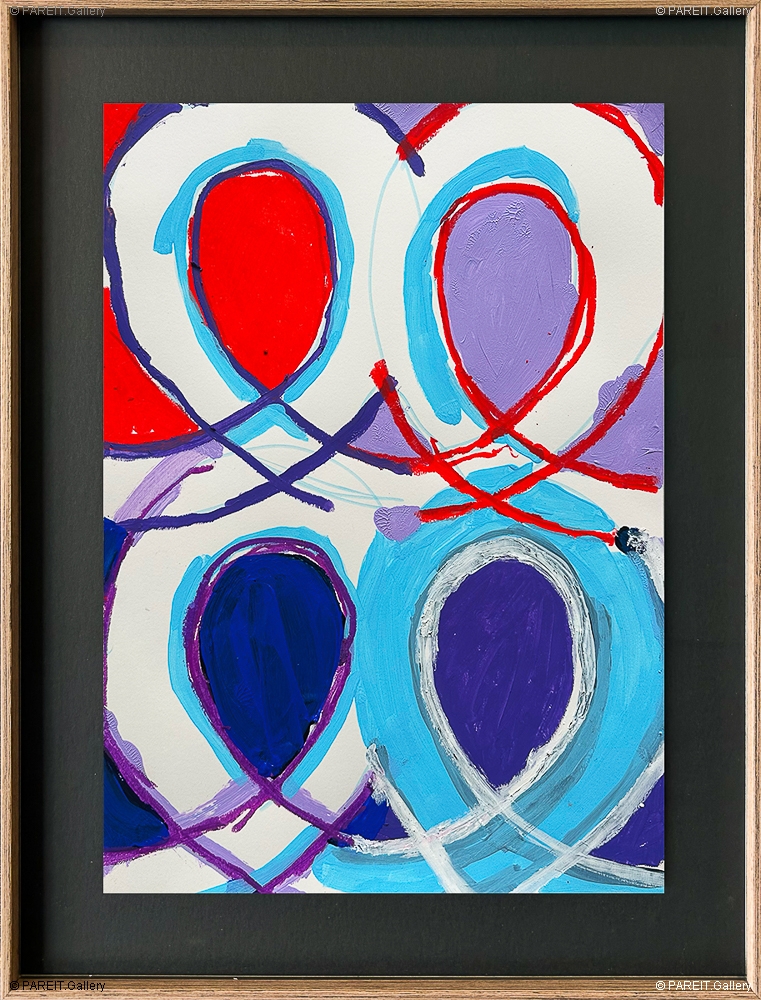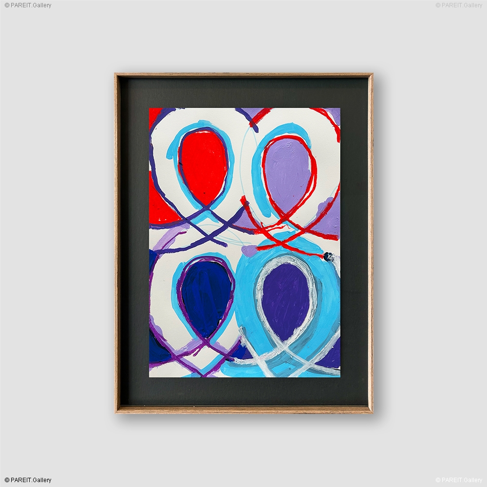 Peinture originale et unique sur papier. L'oeuvre est encadrée dans un élégant cadre en bois, équipée d'un verre anti-UV et prête à être accrochée. Elle se distingue par les "Swoons" reconnaissables : des cercles elliptiques qui réapparaissent sans cesse dans le travail de Piroeh One.