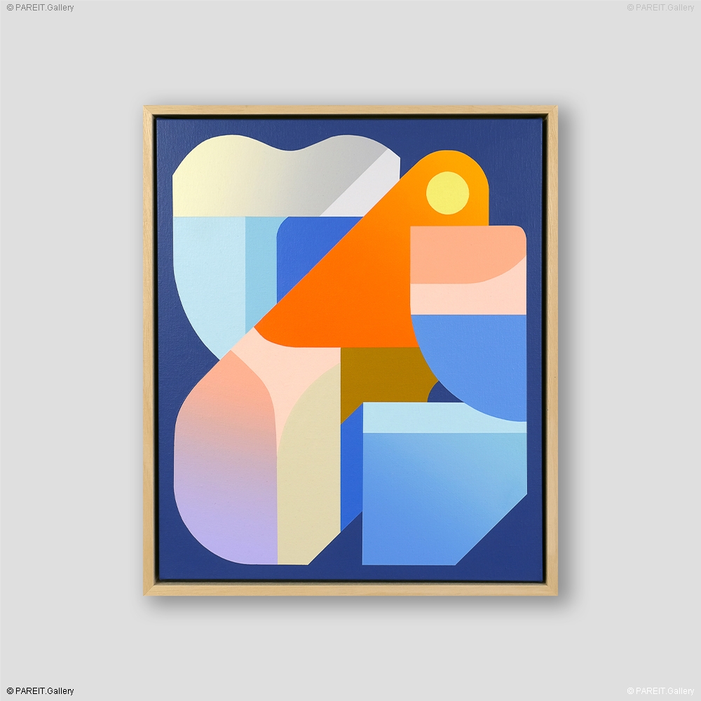 Toile originale, explosive par ses couleurs et ses formes. L'oeuvre est présentée dans une caisse américaine en bois, qui met en valeur la profondeur et l'énergie de la composition.