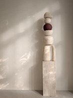Door keramiek te combineren met natuurlijke materialen zoals travertin en hout ontstaat een sobere, tactiele esthetiek die haar werk een duidelijke en herkenbare signatuur geeft.