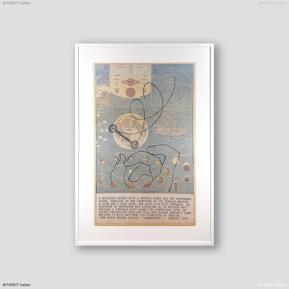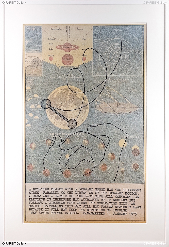 Extra info: Offsetdruk, op karton opgekleefd. Dit gesigneerde en genummerde werk (52/120) wordt aangeboden in een witte lijst met UV-werend glas. Het werk werd uitgebracht ter gelegenheid van een individuele tentoonstelling in het Kölnischer Kunstverein (1975) en is opgenomen in het naslagwerk "Panamarenko Multiples" onder nr. 19.