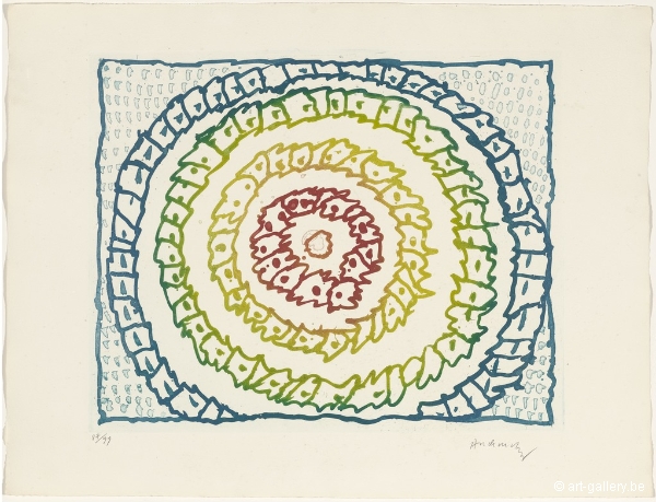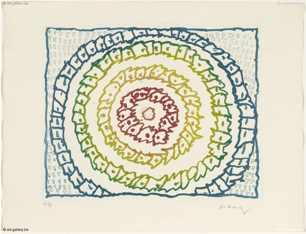 Ets en aquatint van Pierre Alechinsky uit de suite Astres et Désastres. Gesigneerd en genummerd op 99 exemplaren. Dit werk is ingelijst in een houten lijst met