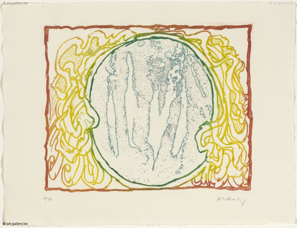 Ets en aquatint van Pierre Alechinsky uit de suite Astres et Désastres. Gesigneerd en genummerd op 99 exemplaren. Dit werk is ingelijst in een houten lijst met