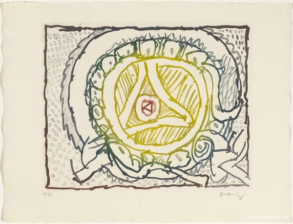Ets en aquatint van Pierre Alechinsky uit de suite Astres et Désastres. Gesigneerd en genummerd op 99 exemplaren. Dit werk is ingelijst in een houten lijst met