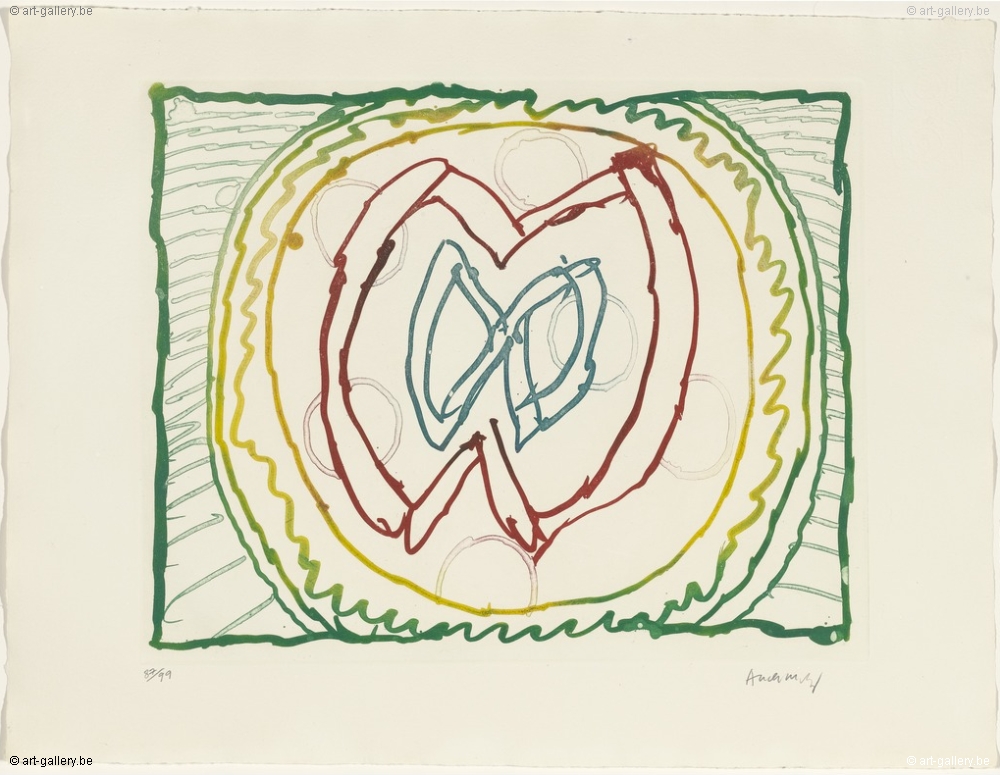Ets en aquatint van Pierre Alechinsky uit de suite Astres et Désastres. Gesigneerd en genummerd op 99 exemplaren. Dit werk is ingelijst in een houten lijst met