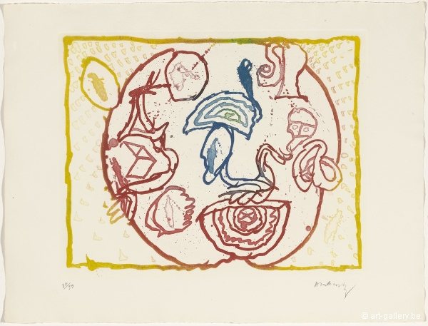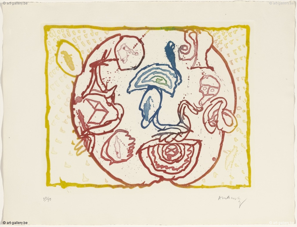 Ets en aquatint van Pierre Alechinsky uit de suite Astres et Désastres. Gesigneerd en genummerd op 99 exemplaren. Dit werk is ingelijst in een houten lijst met
