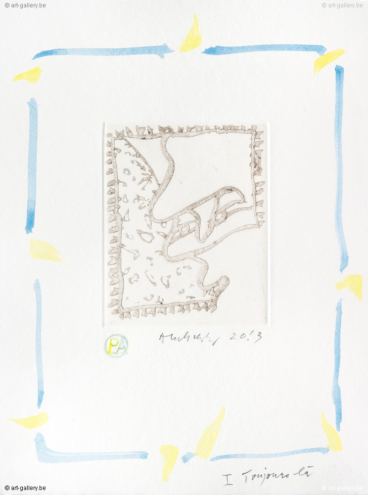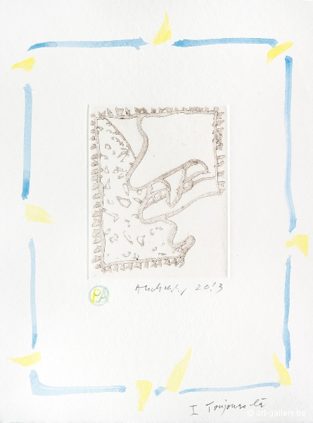 Toujours là is een origineel aquarel op papier van Pierre Alechinsky. Het werk is getekend en getiteld in potlood door Pierre Alechinsky. Dit werk is ingelijst in onstpiegeld glas met een witte lijst.