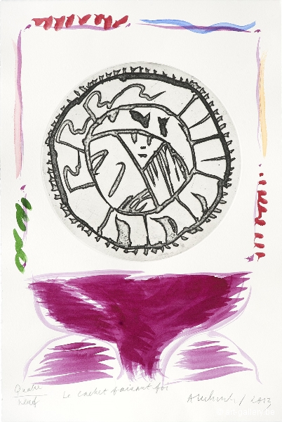 Le cachet faisant foi is een origineel aquarel op papier van Pierre Alechinsky. Het werk is getekend en getiteld in potlood door Pierre Alechinsky. Dit werk is ingelijst in onstpiegeld glas met een witte lijst.