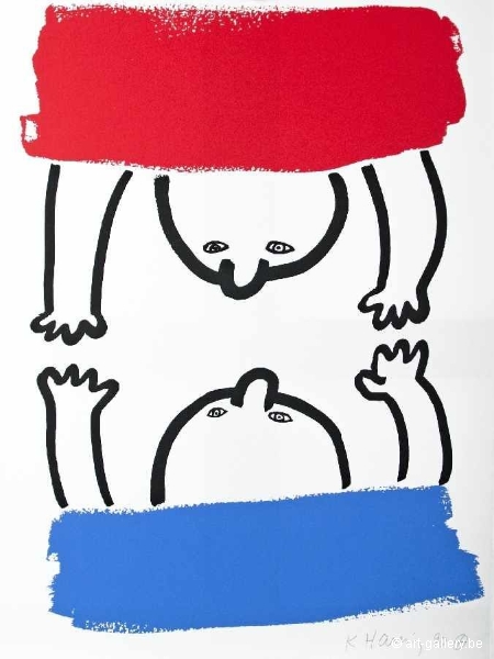 Gesigneerd en genummerd op 90 exemplaren. Achteraan ook een certificaat van de Keith Haring foundation. Voor de reeks Red and Blue gebruikte Keith Haring enkel blauw en rood om op een essentiële en doordachte manier zijn compositie samen te stellen. TOP! Ook ingelijst te verkrijgen voor 4500?.