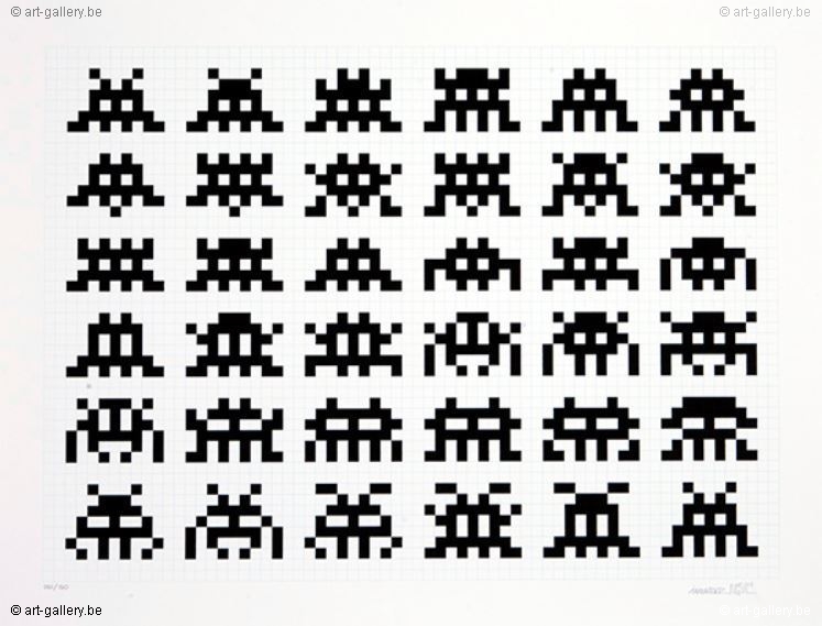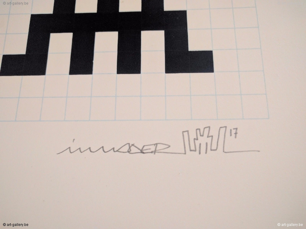 Zeefdruk van Space Invader getekend en genummerd op 150 exemplaren. Dit werk werd mooi ingelijst in ontspiegeld museumglas.