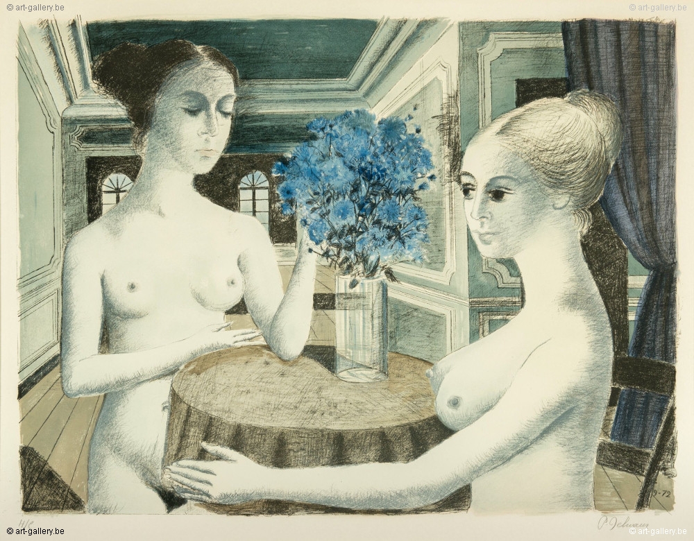 Kleuren lithografie van Paul Delveaux. Getekend en genummerd op 75 exemplaren. Dit betreft de proefdruk. Dit werk werd professioneel ingelijst in een witte lijst.