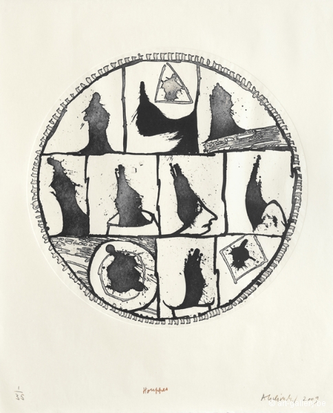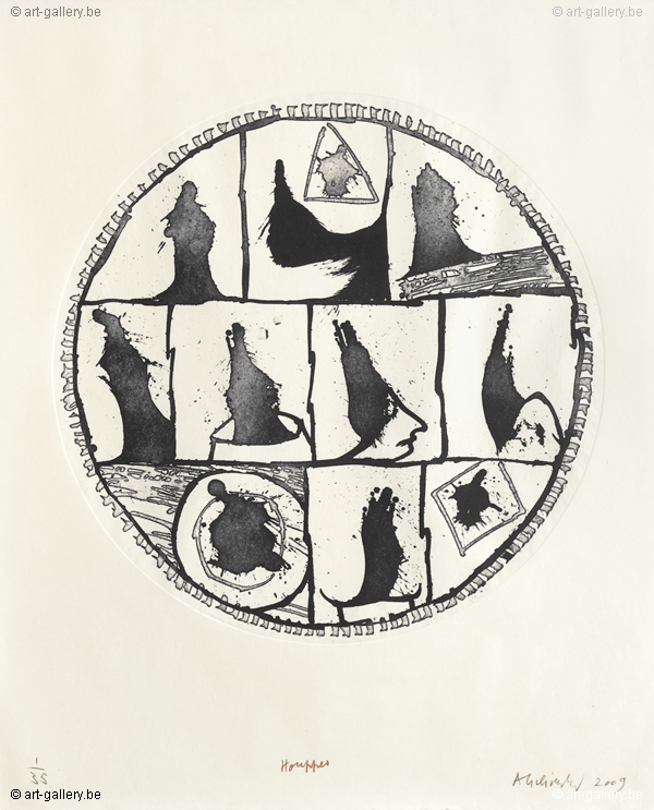 Ets van Pierre Alechinsky op rijstpapier. Getekend en genummerd op 35 exemplaren. Ingelijst in ontspiegeld museumglas met zwarte lijst.