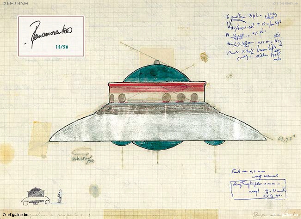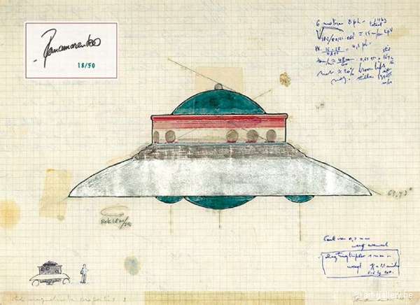 Extra info: Nieuw werk van Panamarenko. De Adamski Schotel is gemaakt in een oplage van 60 exemplaren. Het werk is een zeefdruk op dibond.