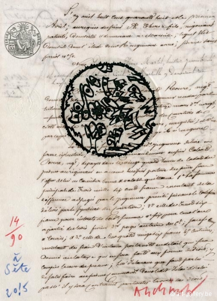 Ets op een oud waardepapier. Getekend en genummerd op 90 exemplaren. Ieder werk is uniek omdat er steeds een afzonderlijk waardepapier gebruikt werd. Dit werk is ingelijst in ontspiegeld museumglas.