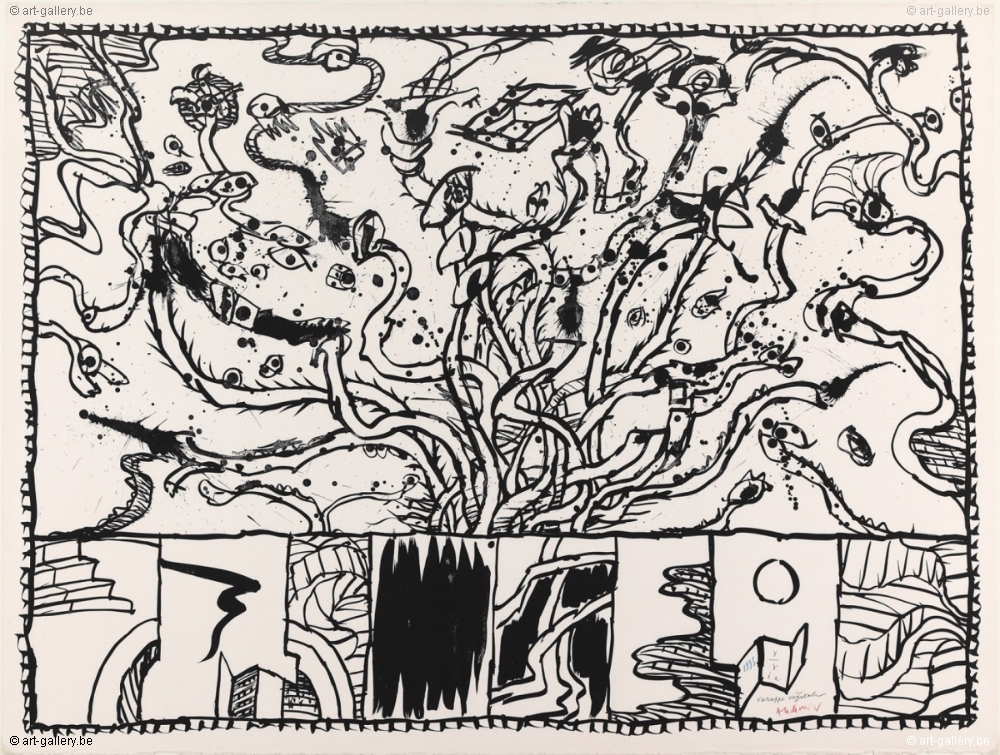 Een van de betere grote kleurenlitho's van Pierre Alechinsky. Dit werk is getekend en genummerd op 35 ex