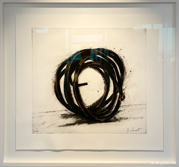 Ets van Bernar Venet. Getekend en genummerd op 60 exemplaren + 12 AP. Ingelijst in een witte lijst met ontspiegeld uv-bestendig glas. Afmetingen inclusief de lijst 123cm x 115cm.