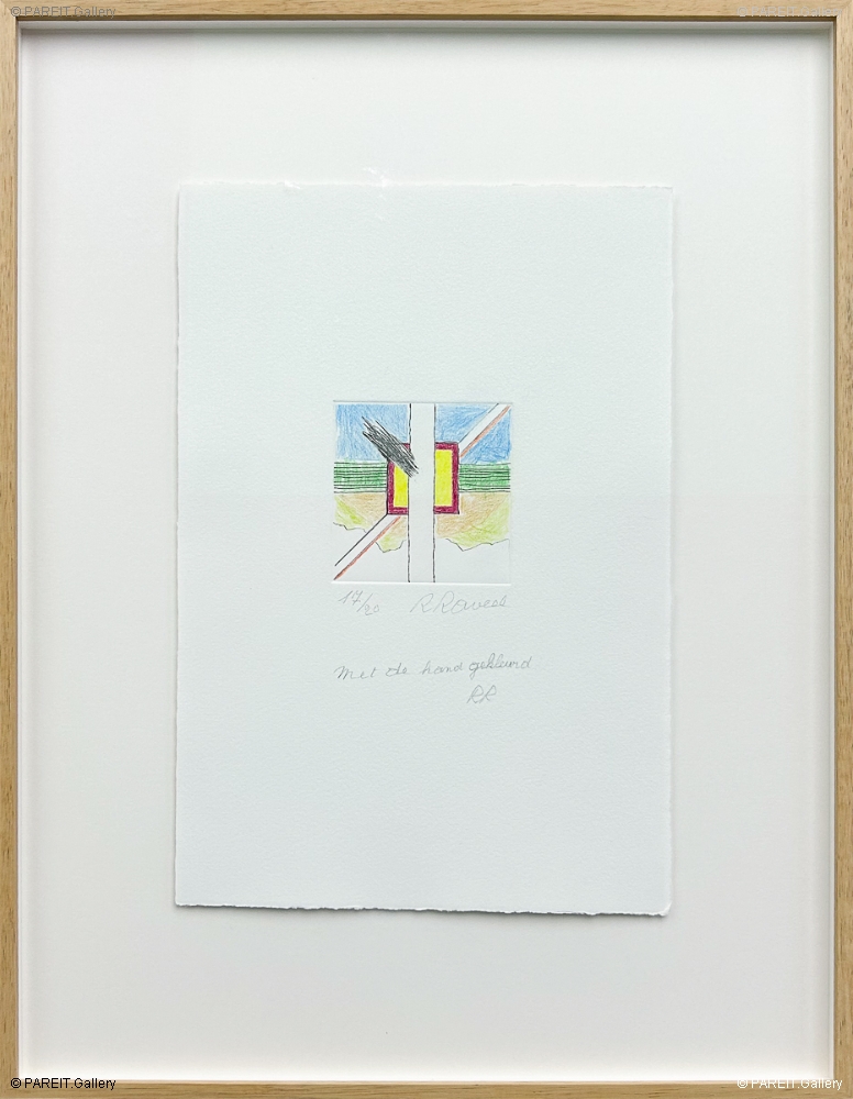 In "Het essentiële 17" brengt Roger Raveel zijn beeldtaal terug tot de kern. Deze ets maakt deel uit van een reeks waarin hij experimenteert met eenvoud, ruimte en het weglaten van overbodige details. Wat overblijft, is een uitgepuurd beeld met slechts enkele lijnen en vormen - een vierkant, contouren en suggestie van beweging - die samen een open, bijna meditatieve sfeer oproepen.