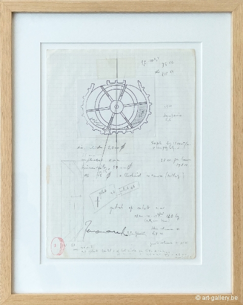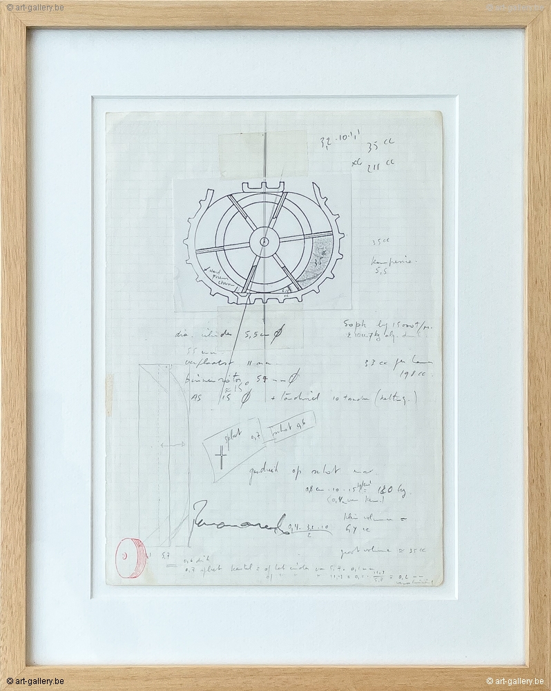 Originele tekening van Panamarenko. Het werk is professioneel ingelijst in een houten kader. Afmetingen incl kader 30 x 37cm.