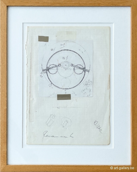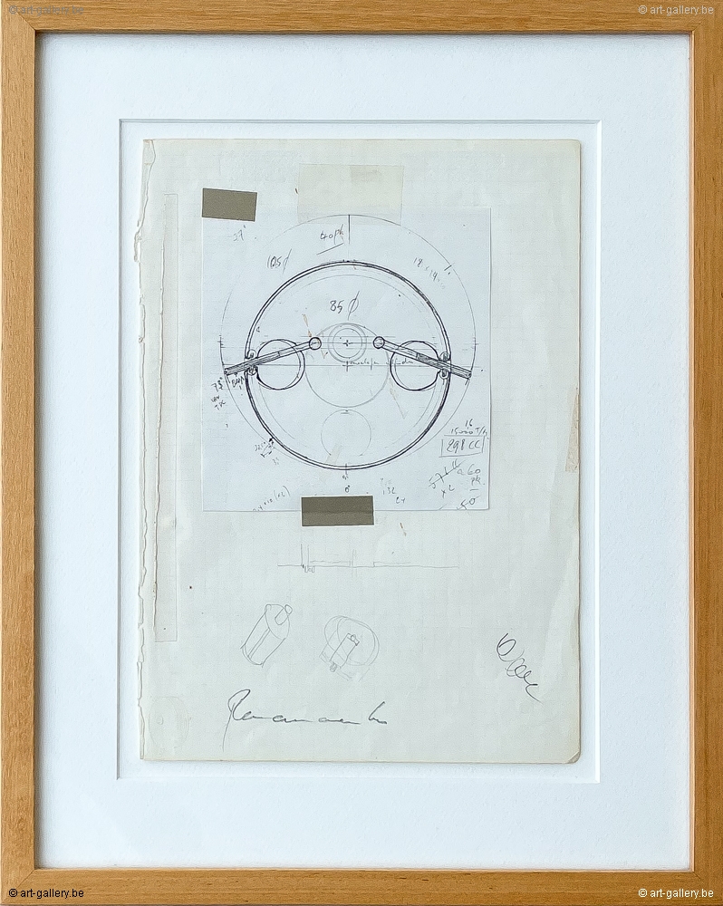 Originele tekening van Panamarenko. Het werk is professioneel ingelijst in een houten kader. Afmetingen incl kader 30 x 37cm.