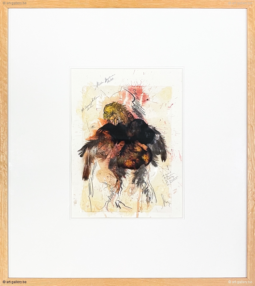 Extra info: Originele, unieke mixed media tekening van Koen VanMechelen. Het werk is aangevuld met echte kippenveren. Onderaan rechts gesigneerd door de kunstenaar. Afmetingen incl. lijst 67cm x 60cm.