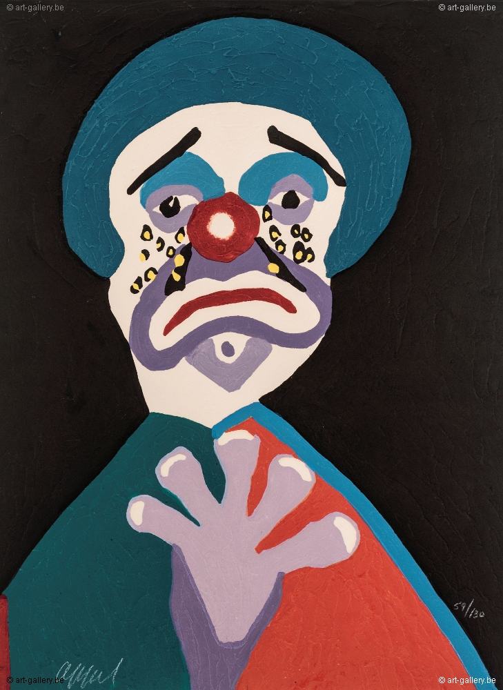 Uit het portfolio Circus van Karel Appel. Houtsnede met reflief getekend en genummerd op 130 exemplaren. Dit werk is mooi ingelijst in een witte lijst met ontspiegeld glass