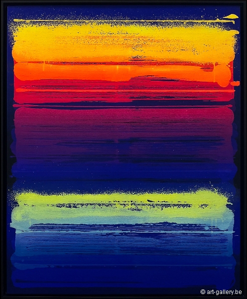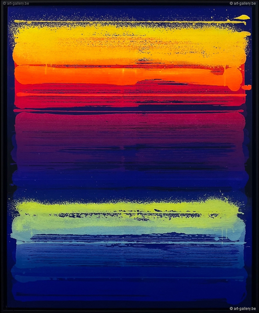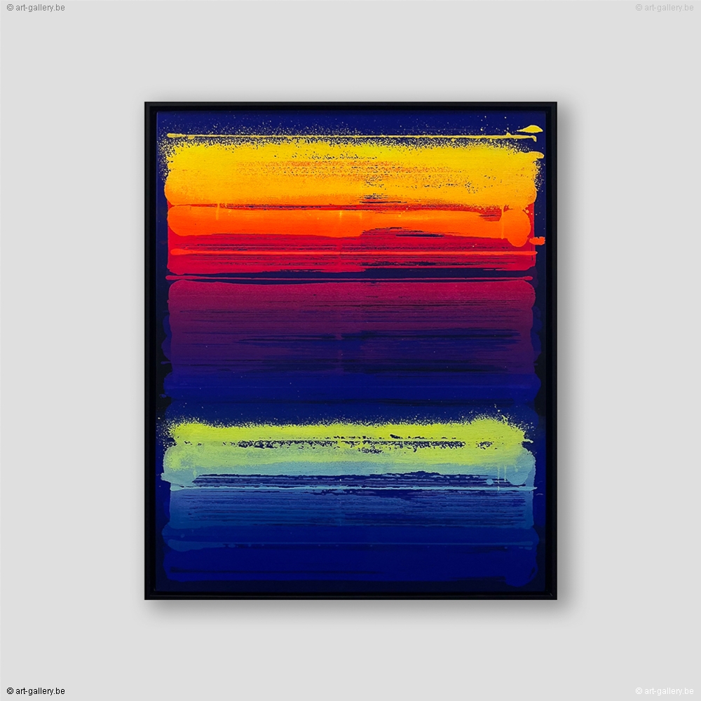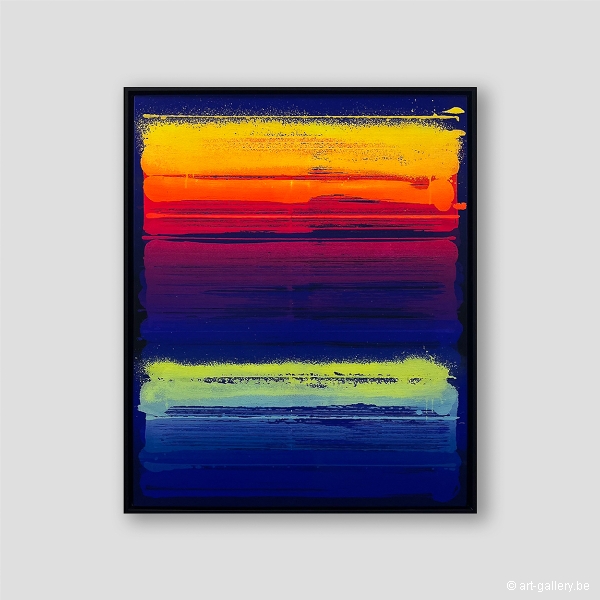 Origineel schilderij op canvas van Franck Noto. Het werk is ingelijst in een houten lijst. De kunstwerken van Franck Noto zijn met een opmerkelijke kracht en precisie vervaardigd. Op het eerste zicht lijken ze verraderlijk simpel. Echter, een nauwkeuriger blik onthult dat de subtiele kleurovergangen niet het resultaat kunnen zijn van een enkele, vloeiende spuitbusbeweging. De graffiti-lijnen zijn met minutieuze aandacht voor detail geschilderd.