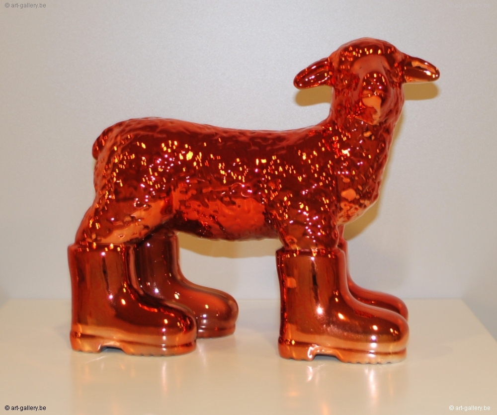 Cloned red porcelain lamb getekend en genummerd op 100 ex. Sculptuur gemaakt in geschilderd porselein.