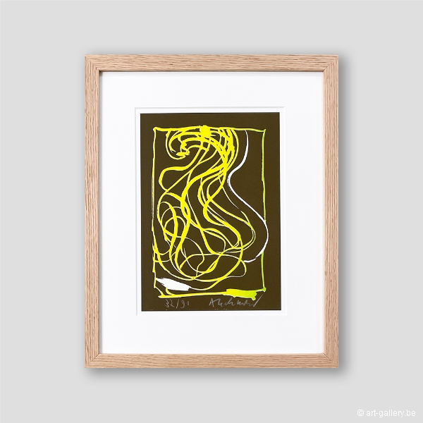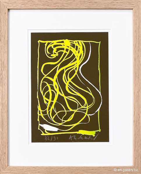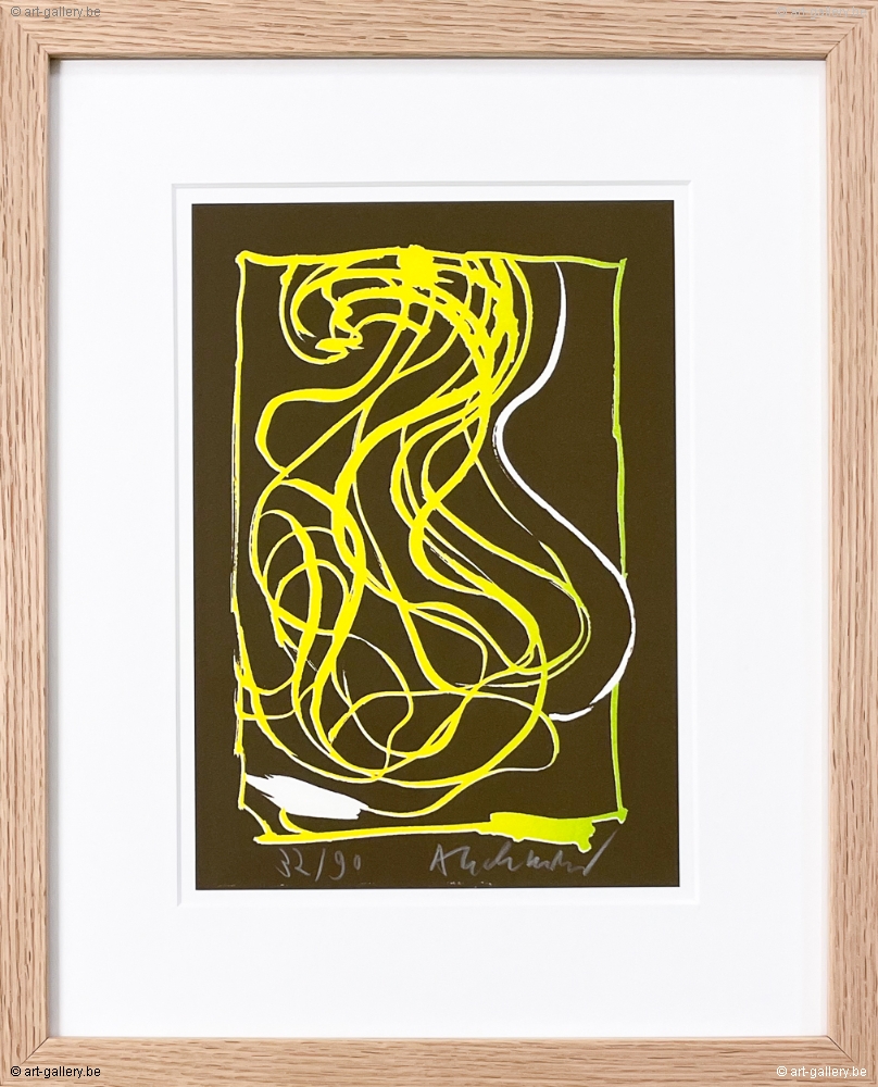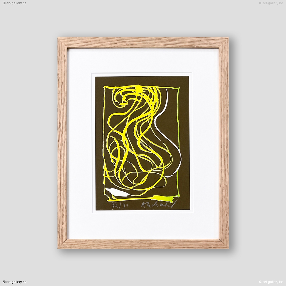 Lithografie van Pierre Alechinsky. Getekend en genummerd op 99 exemplaren. Het werk is ingelijst in ontspiegeld museumglas in een eiken lijst.
