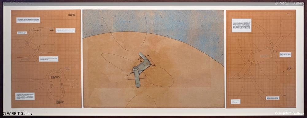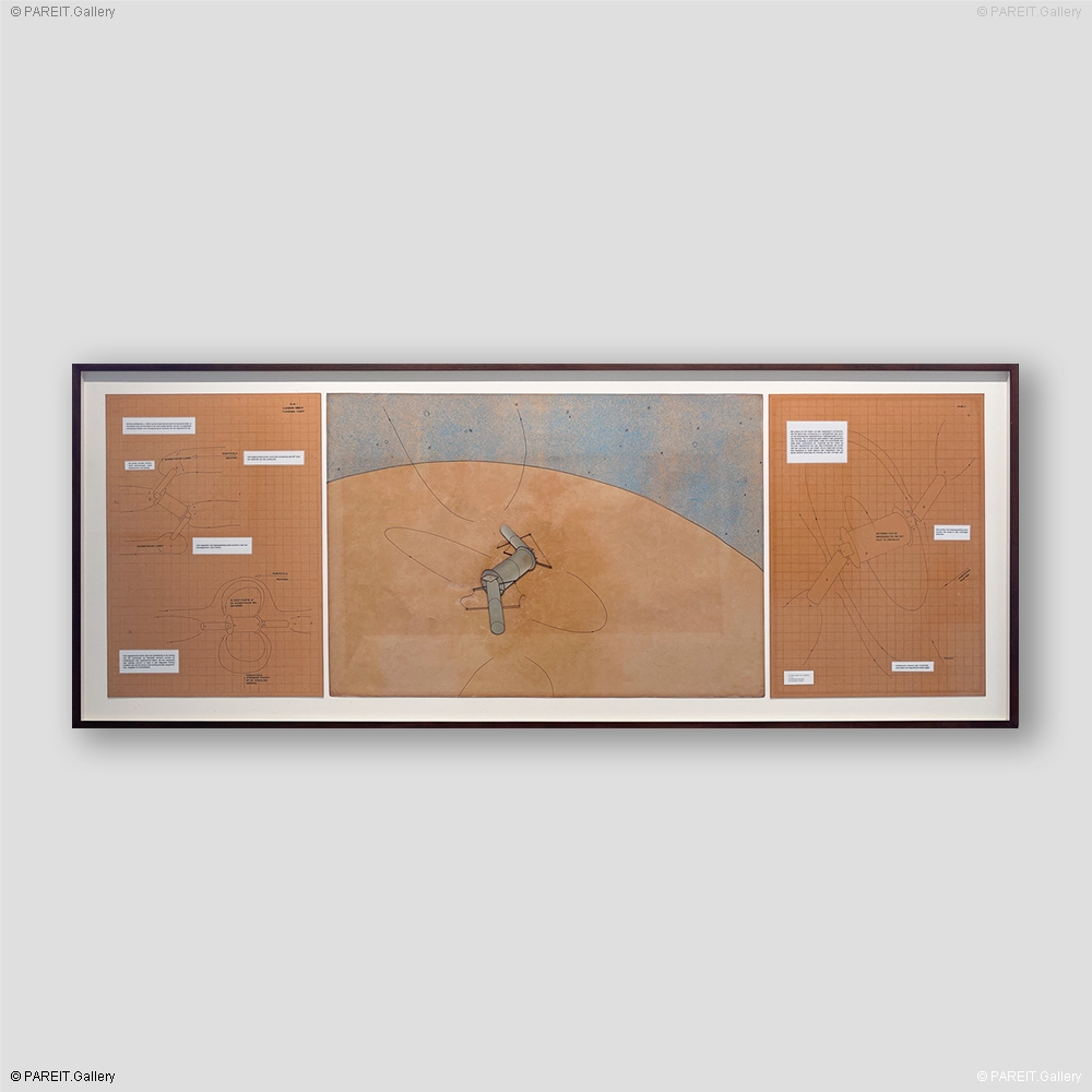 Extra info: Collage in drie afzonderlijke delen. Getekend en genummerd op 10 exemplaren. Niet alle exemplaren zijn gemaakt geweest. Het werk is ingelijst in één grote lijst met ontspiegeld museumglas. Eén van de betere werken van Panamarenko
